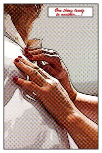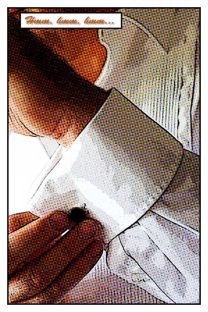 One significant change which came about, was opting to turn it into the ‘comicstrip’ style ‘photo-story’, that you see in the ‘Redtop’ tabloids. This suited the storyline, as it was never going to be a complicated plot. So I was happy to embrace the ‘transparent plot’ and even augment it with words. Having found an online tutorial, it was still a time consuming process.