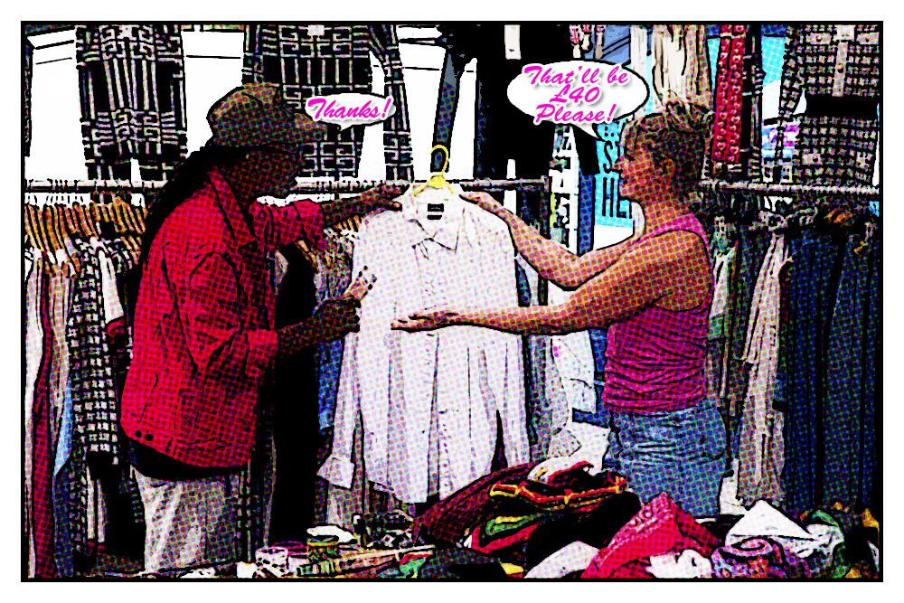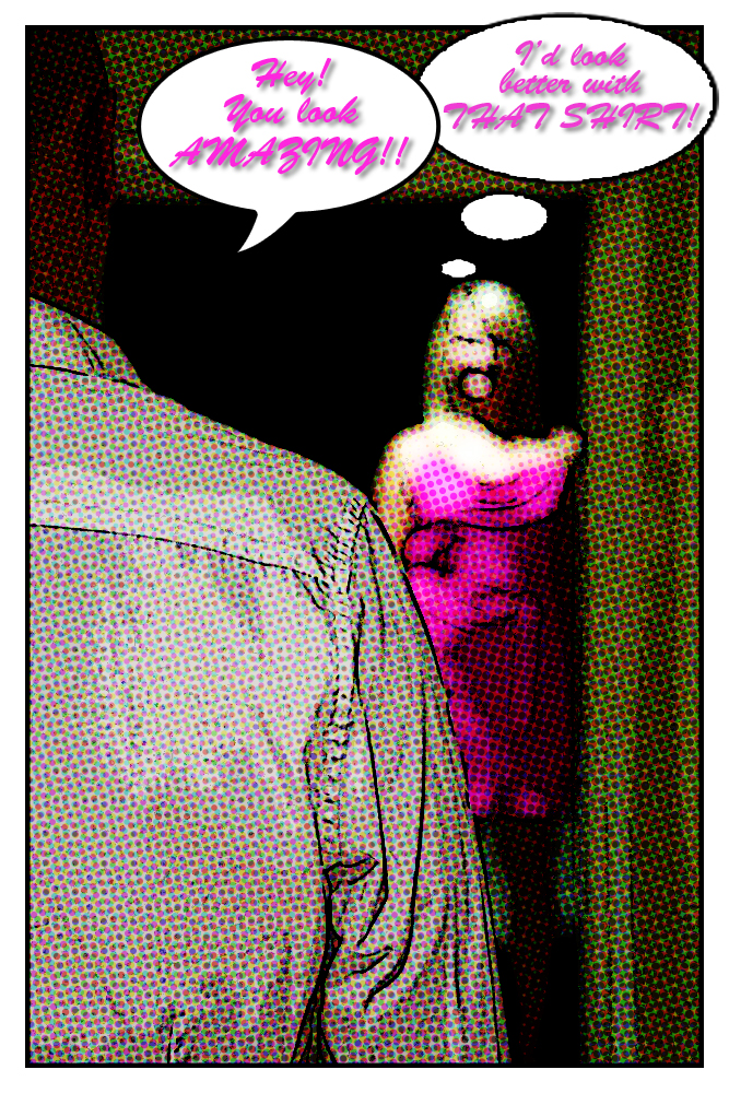 One of the keys to the success of this assignment lay in isolating certain aspects of the shirt (the star of the show) in each image. For this I decided to use my 50mm prime lens. With its f1.4 aperture, I knew I was going to be able to get good image quality and some very shallow DoF to put the subject matter in isolation. Image 5 in particular is a good example of this, because not only is the background out of focus, but the foreground too. This is highlighted in the original shot, but became less obvious when I moved across to the comicstrip format. Images 4 and 5 offer a little bit of humour, with the lady in the dress playing second fiddle in the photographers eye. As before, this is lost in the final set of images.