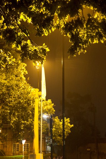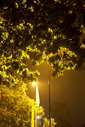 Moving on to the last set of twelve images, these were all taken under Tungsten street lights. Knowing what the general outcome would be, I was eager to see what results would be achieved by filtering the light through trees. It was interesting to see the results being that the purple hue is largely lost to the green cast by the foliage of the trees. Again, some of the shots were replicated to try to get an alternative/cover to rain drops on the camera lens. Although this did bring to mind my thoughts on Sally Mann’s work and also that of Venetia Dearden whereby they are not afraid to shoot into the sun, thus changing the mood of image all together.