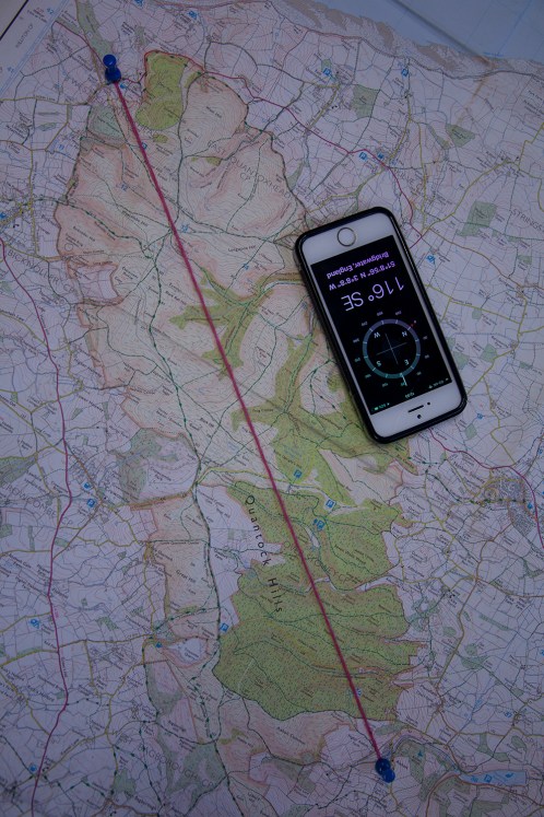 This James Ravilious image is so raw and evocative, that it should have been easy to come up with my own response, but proved to be surprisingly difficult! In spite of the abhorrent conditions, Ivor Brock is determined at all cost to get that lamb to the safety of some form of shelter (presumably), and the look of sheer unwavering determination in his eyes is the true essence of what this image is all about. My objective was to convey his determination without using a direct comparison to another human form. My first idea was to take a photo of a long straight road that led off into the distance. I couldn’t find anything that fitted what I had in my mind’s eye. A compromise would be a section of motorway, but they proved to be too wide, and would not give me the feeling of directness that I wanted. So from researching the motorway idea I had at least discovered that the single-minded determination had to be quite a narrow line as well as straight. After more pondering I finally came up with the idea of a straight line on a map, much like you would see in an old war film, ‘the direct route of attack’. To augment this directness, and to tie in with the original image I felt that the straight line had to dissect some terrain that would prove challenging, and therefore came up with a section of a map which shows the Quantock hills which fall down almost into my back garden.