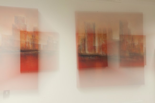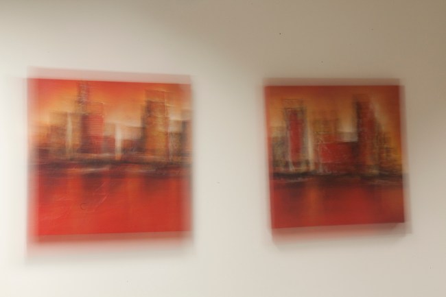 My starting point was to turn the basic movement idea on its head, and take photos of static objects, but record the movement of the camera using slow shutter speeds. The first image below, of two red paintings on a pastel coloured wall, produced a very soft edged image.